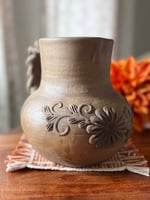 The Bidó pitcher, featuring a smooth finish with embroidered flowers and braided handle, is carefully handcrafted and inspired by prehistoric Zapotec art—made by our artisan partner in Atzompa, Oaxaca.
