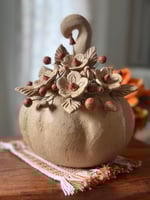 Add rustic charm to your fall decor with this handcrafted clay pumpkin. Made from natural clay and pigments, it's adorned with detailed flowers, leaves, for a warm, seasonal touch. It's perfect for mantels, tables, or cozy corners.